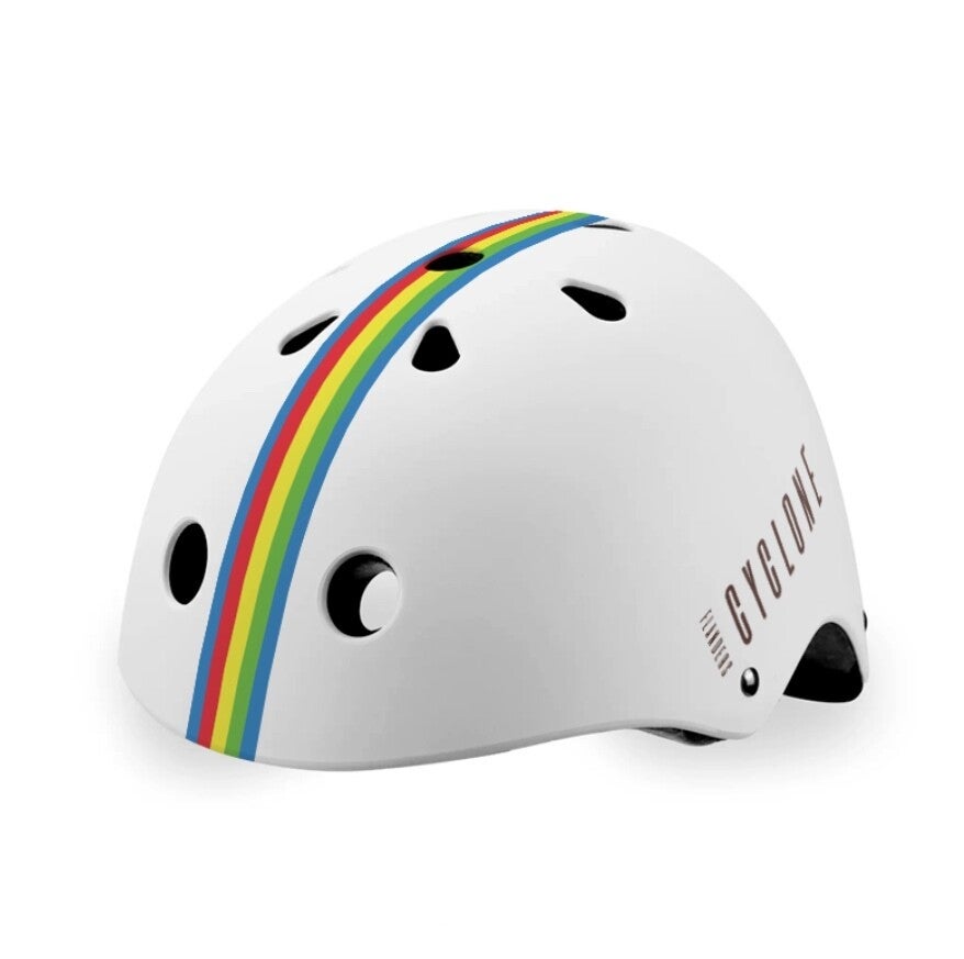 Designed for Future Champions The Flanders CYCLONE kids helmet combines safety, comfort, and iconic style to inspire the next generation of cyclists. Featuring a sleek white design with champion rainbow-colored striping, it’s the perfect match for our Flanders CYCLONE balance bikes.